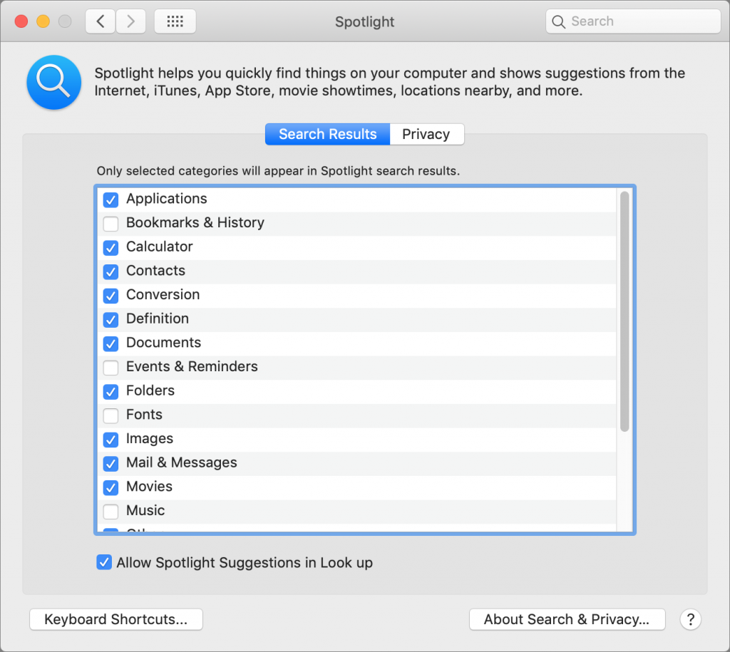 You’ve probably noticed all sorts of other odd items in the results list. That’s because there’s no telling what old email messages or documents might also contain your search term. But you can trim the results somewhat by turning certain items off. To do this, open System Preferences > Spotlight and deselect any categories that aren’t helpful.