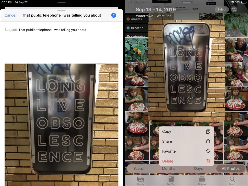Imagine that you want to email someone a photo you took, so you want Mail and Photos showing at the same time. Displaying two apps side-by-side in Split View is nearly the same action as Slide Over. The difference is that, instead of dropping the app lozenge on top of the current app, you drag it to the far left or right of the screen, and drop it once the screen shows a 90/10 split—after you drop, the split changes to 50/50.